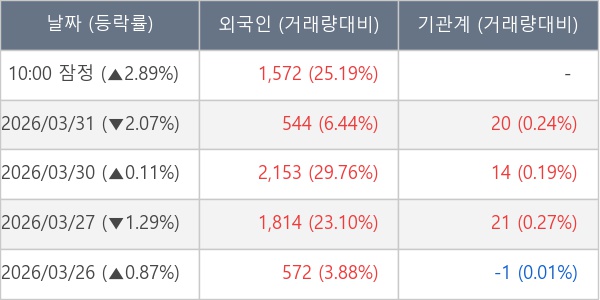 [서울=뉴스핌] 로보뉴스 = 01일 10시 15분 현재 차AI헬스케어(025620)는 전일 대비 2.89% (현재가 9,260원) 상승했고, 외국인이 최근 5일 연속 순매수(누적 6,655주, 잠정) 행진을 하고 있다.