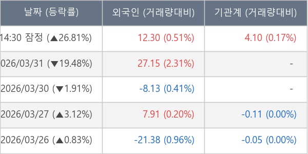 [서울=뉴스핌] 로보뉴스 = 01일 14시 35분 현재 빛과전자(069540)는 외국인과 기관이 각각 12.30 만 주, 4.10 만 주 순매수(잠정) 하면서 전일 대비 26.81% (현재가 3,145원) 상승하고 있다.