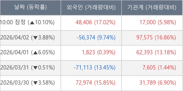[서울=뉴스핌] 로보뉴스 = 03일 10시 15분 현재 한국카본(017960)은 전일 대비 10.10% (현재가 43,600원) 상승했고, 기관이 최근 5일 연속 순매수(누적 21.64만 주, 잠정) 행진을 하고 있다.