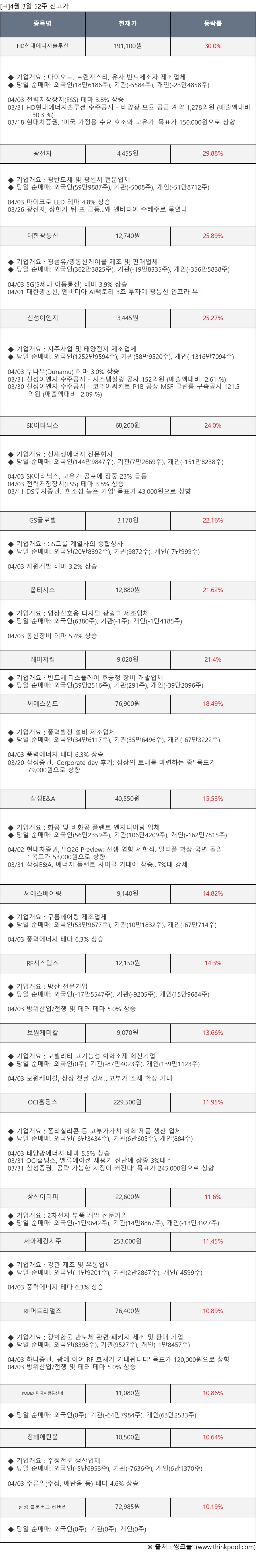 [서울=뉴스핌] 로보뉴스 = 4월 3일, 인공지능 투자비서 ‘AI라씨로’는 52주 신고가가 발생한 HD현대에너지솔루션(322000), 광전자(017900) 등의 최근 동향을 분석해서 발표했다.