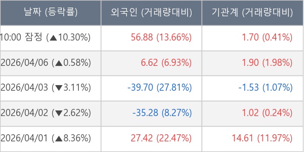 [서울=뉴스핌] 로보뉴스 = 07일 10시 15분 현재 에코프로머티(450080)는 외국인과 기관이 각각 56.88 만 주, 1.70 만 주 순매수(잠정) 하면서 전일 대비 10.30% (현재가 76,000원) 상승하고 있다.