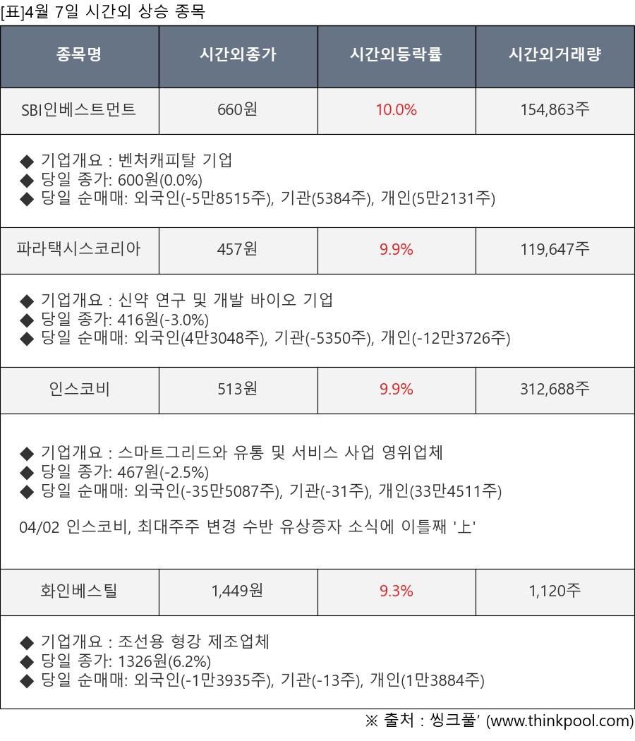 [서울=뉴스핌] 로보뉴스 = 4월 7일, 인공지능 투자비서 ‘AI라씨로’가 SBI인베스트먼트(019550), 파라택시스코리아(288330) 등 시간외 단일가 매매 상승률 상위 종목들에 대한 최근 동향을 분석했다.