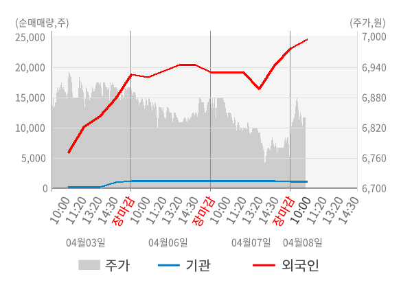 [서울=뉴스핌] 로보뉴스 = 08일 10시 15분 현재 한국주철관(000970)은 전일 대비 1.33% (현재가 6,840원) 상승했고, 외국인이 최근 6일 연속 순매수(누적 30,995주, 잠정) 행진을 하고 있다.