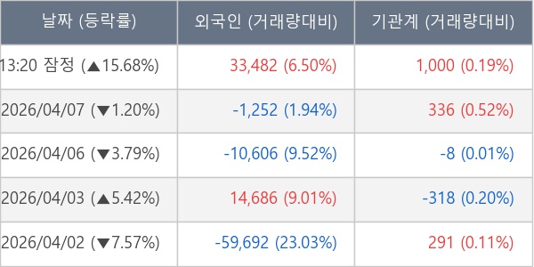 [서울=뉴스핌] 로보뉴스 = 08일 13시 30분 현재 한신공영(004960)은 외국인과 기관이 각각 3.35 만 주, 0.10 만 주 순매수(잠정) 하면서 전일 대비 15.68% (현재가 17,120원) 상승하고 있다.