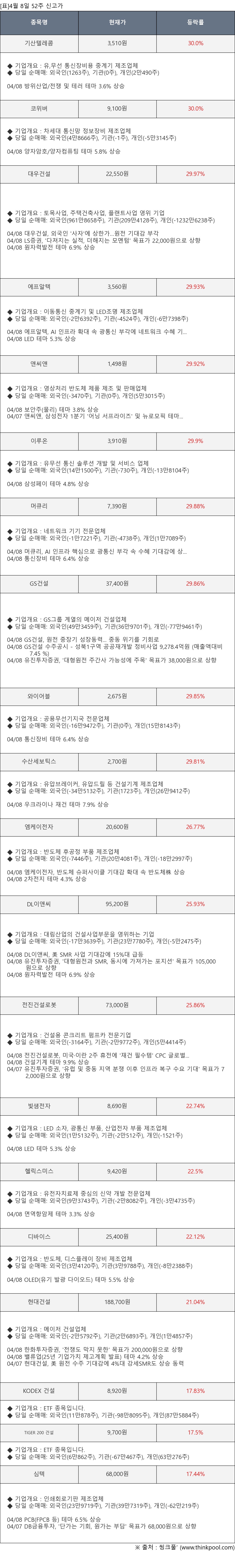 ※ 관련 종목: 기산텔레콤, 코위버, 대우건설, 에프알텍, 앤씨앤, 이루온, 머큐리, GS건설, 와이어블, 수산세보틱스, 엠케이전자, DL이앤씨, 전진건설로봇, 빛샘전자, 헬릭스미스, 디바이스, 현대건설, KODEX 건설, TIGER 200 건설, 심텍
