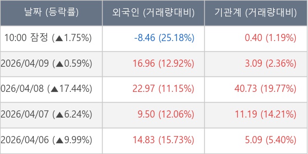 [서울=뉴스핌] 로보뉴스 = 10일 10시 15분 현재 심텍(222800)은 전일 대비 1.75% (현재가 69,600원) 상승했고, 기관이 최근 6일 연속 순매수(누적 63.85만 주, 잠정) 행진을 하고 있다.