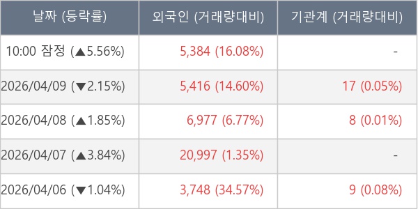[서울=뉴스핌] 로보뉴스 = 10일 10시 15분 현재 엔시스(333620)는 전일 대비 5.56% (현재가 6,260원) 상승했고, 외국인이 최근 5일 연속 순매수(누적 42,522주, 잠정) 행진을 하고 있다.