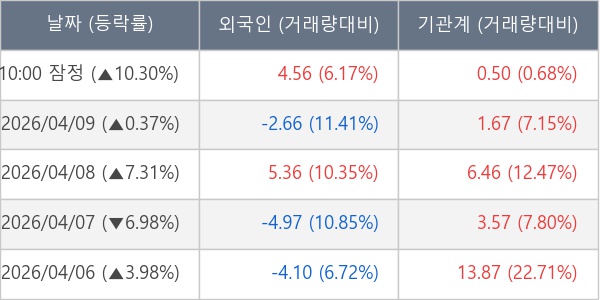 [서울=뉴스핌] 로보뉴스 = 10일 10시 15분 현재 아모텍(052710)은 전일 대비 10.30% (현재가 17,880원) 상승했고, 기관이 최근 9일 연속 순매수(누적 72.07만 주, 잠정) 행진을 하고 있다.