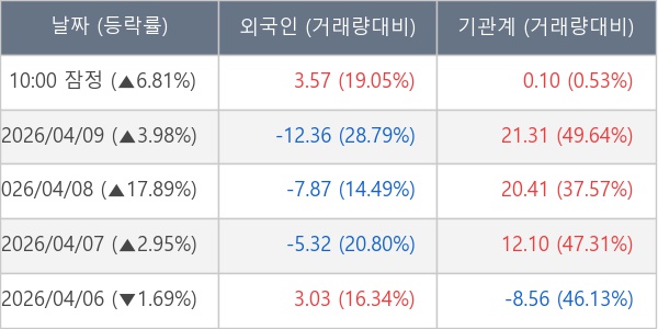 [서울=뉴스핌] 로보뉴스 = 10일 10시 15분 현재 예스티(122640)는 외국인과 기관이 각각 3.57 만 주, 0.10 만 주 순매수(잠정) 하면서 전일 대비 6.81% (현재가 25,100원) 상승하고 있다.