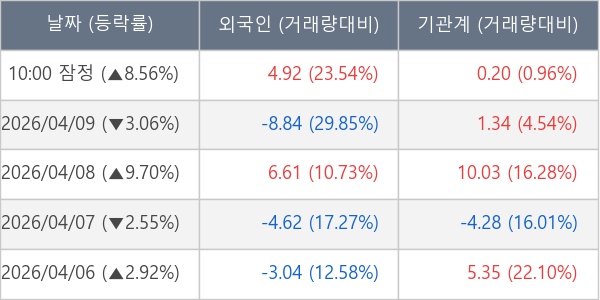 [서울=뉴스핌] 로보뉴스 = 10일 10시 15분 현재 산일전기(062040)는 외국인과 기관이 각각 4.92 만 주, 0.20 만 주 순매수(잠정) 하면서 전일 대비 8.56% (현재가 154,700원) 상승하고 있다.