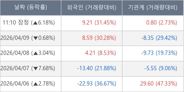 [서울=뉴스핌] 로보뉴스 = 10일 11시 30분 현재 한국카본(017960)은 외국인과 기관이 각각 9.21 만 주, 0.80 만 주 순매수(잠정) 하면서 전일 대비 6.18% (현재가 46,400원) 상승하고 있다.