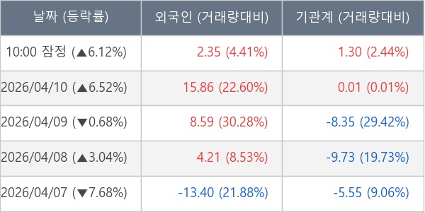 [서울=뉴스핌] 로보뉴스 = 13일 10시 15분 현재 한국카본(017960)은 외국인과 기관이 각각 2.35 만 주, 1.30 만 주 순매수(잠정) 하면서 전일 대비 6.12% (현재가 49,400원) 상승하고 있다.