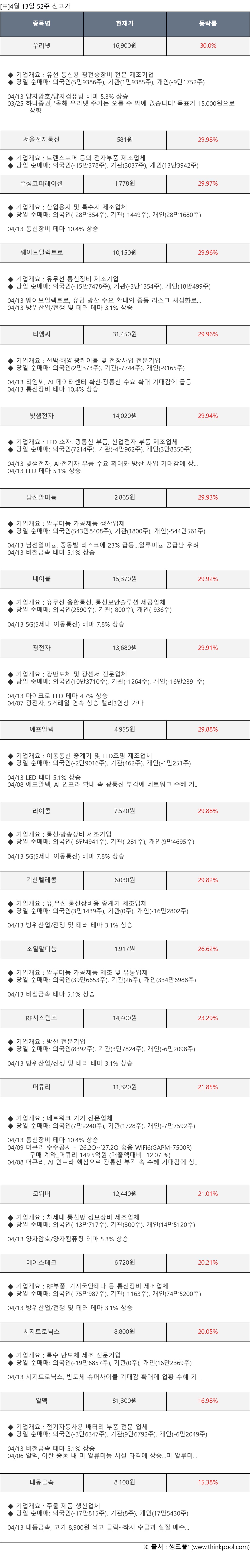 [표]4월 13일 52주 신고가 종목 및 최근 동향