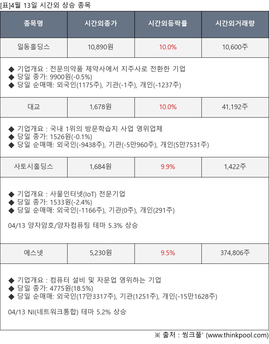 [서울=뉴스핌] 로보뉴스 = 4월 13일, 인공지능 투자비서 ‘AI라씨로’는 시간외 단일가 매매에서 크게 상승한 일동홀딩스(000230), 대교(019680) 등에 대해 최근 동향을 분석했다.
