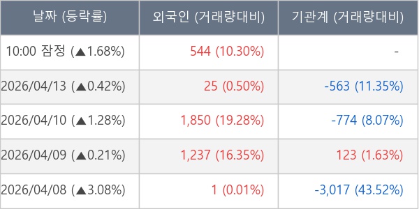[서울=뉴스핌] 로보뉴스 = 14일 10시 15분 현재 쿠쿠홈시스(284740)는 전일 대비 1.68% (현재가 24,250원) 상승했고, 외국인이 최근 5일 연속 순매수(누적 3,657주, 잠정) 행진을 하고 있다.