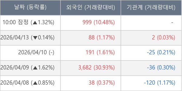 [서울=뉴스핌] 로보뉴스 = 14일 10시 15분 현재 조선내화(462520)는 전일 대비 1.32% (현재가 14,610원) 상승했고, 외국인이 최근 14일 연속 순매수(누적 18,356주, 잠정) 행진을 하고 있다.