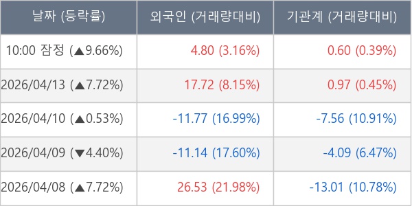 [서울=뉴스핌] 로보뉴스 = 14일 10시 15분 현재 네오셈(253590)은 외국인과 기관이 각각 4.80 만 주, 0.60 만 주 순매수(잠정) 하면서 전일 대비 9.66% (현재가 18,050원) 상승하고 있다.