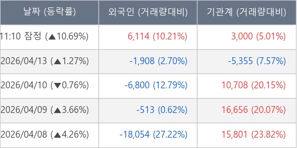[서울=뉴스핌] 로보뉴스 = 14일 11시 30분 현재 티에스이(131290)는 외국인과 기관이 각각 0.61 만 주, 0.30 만 주 순매수(잠정) 하면서 전일 대비 10.69% (현재가 132,500원) 상승하고 있다.