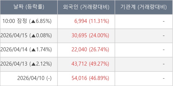 [서울=뉴스핌] 로보뉴스 = 16일 10시 15분 현재 나노실리칸첨단소재(286750)는 전일 대비 6.85% (현재가 1,310원) 상승했고, 외국인이 최근 5일 연속 순매수(누적 15.75만 주, 잠정) 행진을 하고 있다.