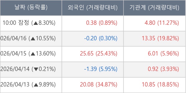 [장중수급포착] 덕산테코피아, 기관 5일 연속 순매수행진... 주가 +8.30%