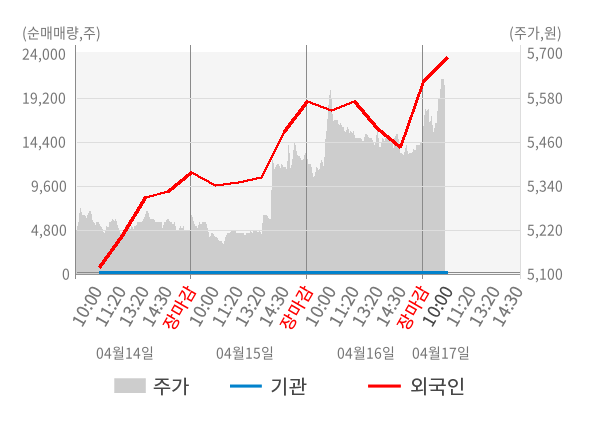 [서울=뉴스핌] 로보뉴스 = 17일 10시 15분 현재 피엔에이치테크(239890)는 전일 대비 2.56% (현재가 5,600원) 상승했고, 외국인이 최근 7일 연속 순매수(누적 52,970주, 잠정) 행진을 하고 있다.