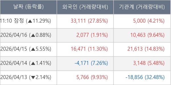 [서울=뉴스핌] 로보뉴스 = 17일 11시 30분 현재 성일하이텍(365340)은 외국인과 기관이 각각 3.31 만 주, 0.50 만 주 순매수(잠정) 하면서 전일 대비 11.29% (현재가 76,900원) 상승하고 있다.