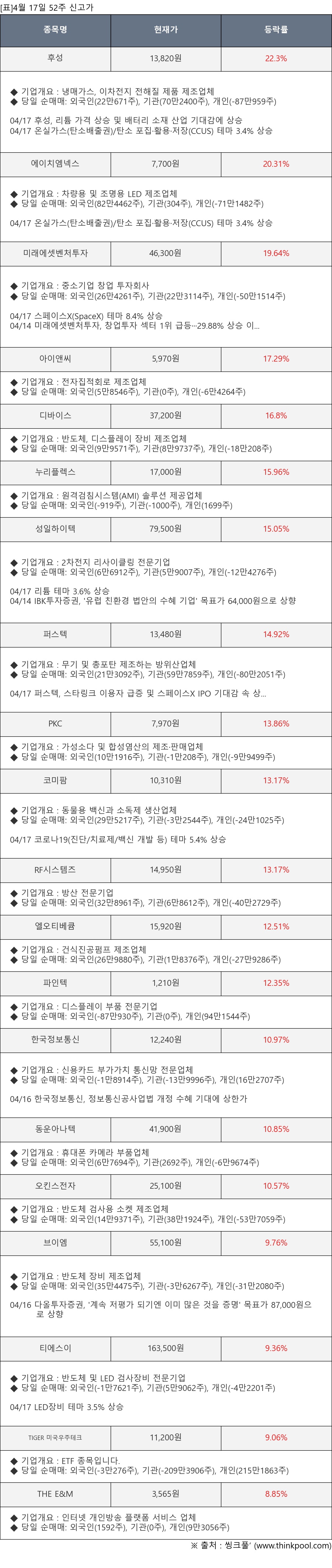 [서울=뉴스핌] 로보뉴스 = 4월 17일, 인공지능 투자비서 ‘AI라씨로’가 후성(093370), 에이치엠넥스(036170) 등 52주 신고가가 발생한 종목들에 대한 최근 동향을 분석했다.