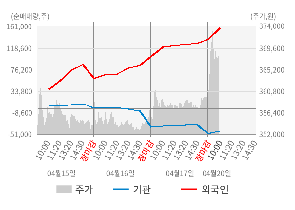 [서울=뉴스핌] 로보뉴스 = 20일 10시 15분 현재 LG화학(051910)은 전일 대비 2.22% (현재가 368,000원) 상승했고, 외국인이 최근 5일 연속 순매수(누적 16.13만 주, 잠정) 행진을 하고 있다.