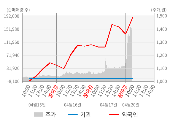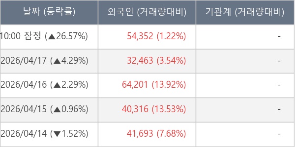 [서울=뉴스핌] 로보뉴스 = 20일 10시 15분 현재 삼진엘앤디(054090)는 전일 대비 26.57% (현재가 1,415원) 상승했고, 외국인이 최근 6일 연속 순매수(누적 32.20만 주, 잠정) 행진을 하고 있다.