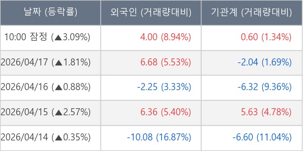 [서울=뉴스핌] 로보뉴스 = 20일 10시 15분 현재 에코프로(086520)는 외국인과 기관이 각각 4.00 만 주, 0.60 만 주 순매수(잠정) 하면서 전일 대비 3.09% (현재가 156,600원) 상승하고 있다.