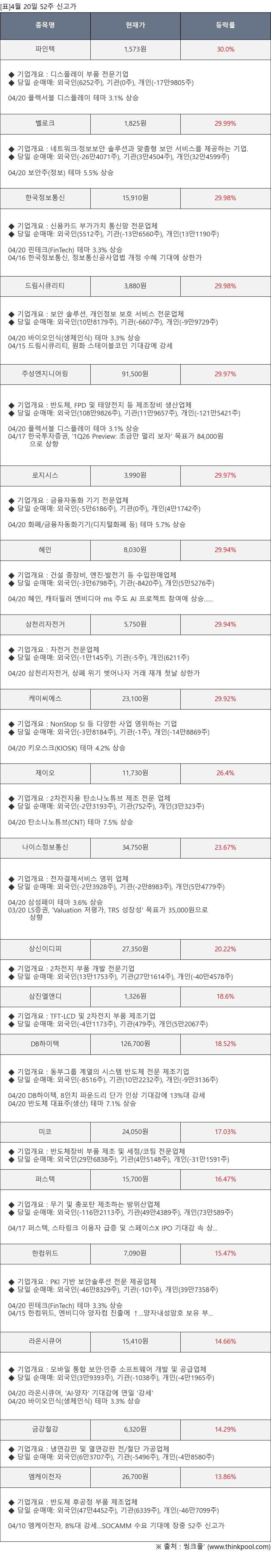[표]4월 20일 52주 신고가 종목 및 최근 동향