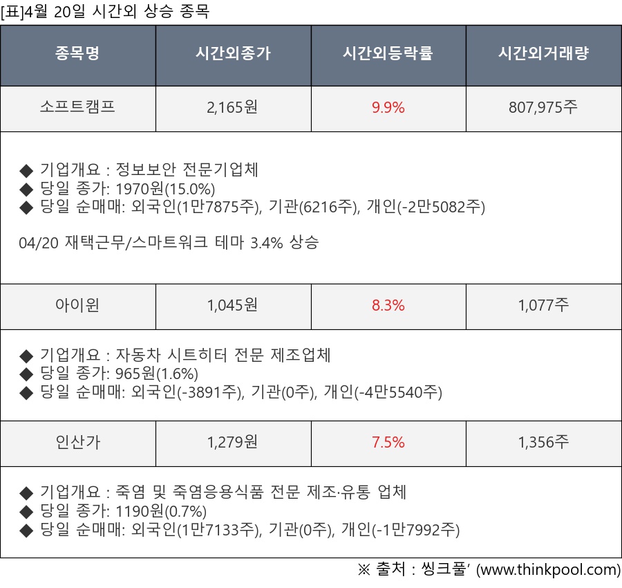 [표]4월 20일 시간외 상승 종목 및 최근 동향