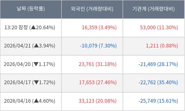 [서울=뉴스핌] 로보뉴스 = 22일 13시 30분 현재 SGC에너지(005090)는 외국인과 기관이 각각 1.64 만 주, 5.30 만 주 순매수(잠정) 하면서 전일 대비 20.64% (현재가 63,700원) 상승하고 있다.