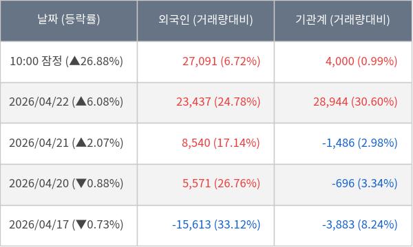 [서울=뉴스핌] 로보뉴스 = 23일 10시 15분 현재 사피엔반도체(452430)는 외국인과 기관이 각각 2.71 만 주, 0.40 만 주 순매수(잠정) 하면서 전일 대비 26.88% (현재가 46,500원) 상승하고 있다.