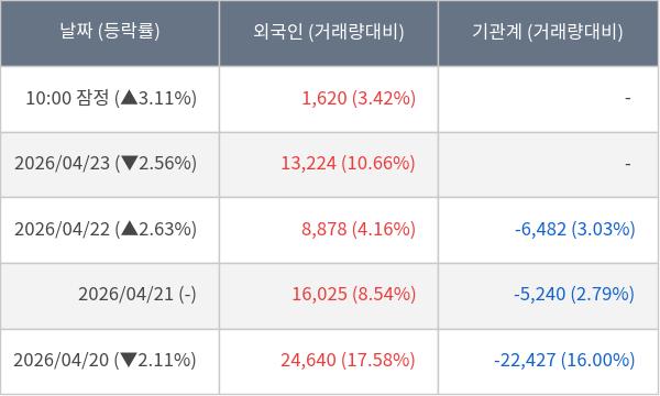 [서울=뉴스핌] 로보뉴스 = 24일 10시 15분 현재 큐알티(405100)는 전일 대비 3.11% (현재가 21,550원) 상승했고, 외국인이 최근 6일 연속 순매수(누적 71,106주, 잠정) 행진을 하고 있다.
