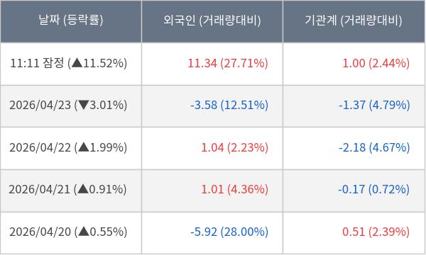 [서울=뉴스핌] 로보뉴스 = 24일 11시 30분 현재 에이디테크놀로지(200710)는 외국인과 기관이 각각 11.34 만 주, 1.00 만 주 순매수(잠정) 하면서 전일 대비 11.52% (현재가 61,000원) 상승하고 있다.