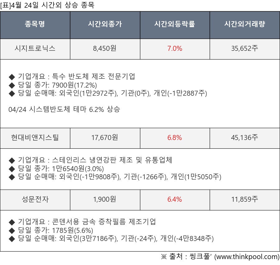[서울=뉴스핌] 로보뉴스 = 4월 24일, 인공지능 투자비서 ‘AI라씨로’는 시간외 단일가 매매에서 크게 상승한 시지트로닉스(429270), 현대비앤지스틸(004560) 등에 대해 최근 동향을 분석했다.