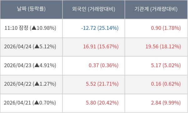 [서울=뉴스핌] 로보뉴스 = 27일 11시 30분 현재 일진전기(103590)는 전일 대비 10.98% (현재가 107,100원) 상승했고, 기관이 최근 6일 연속 순매수(누적 29.62만 주, 잠정) 행진을 하고 있다.
