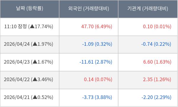 [서울=뉴스핌] 로보뉴스 = 27일 11시 30분 현재 티씨머티리얼즈(125020)는 외국인과 기관이 각각 47.70 만 주, 0.10 만 주 순매수(잠정) 하면서 전일 대비 17.74% (현재가 7,300원) 상승하고 있다.