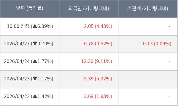 [서울=뉴스핌] 로보뉴스 = 28일 10시 15분 현재 SV인베스트먼트(289080)는 전일 대비 6.89% (현재가 4,575원) 상승했고, 외국인이 최근 5일 연속 순매수(누적 24.21만 주, 잠정) 행진을 하고 있다.