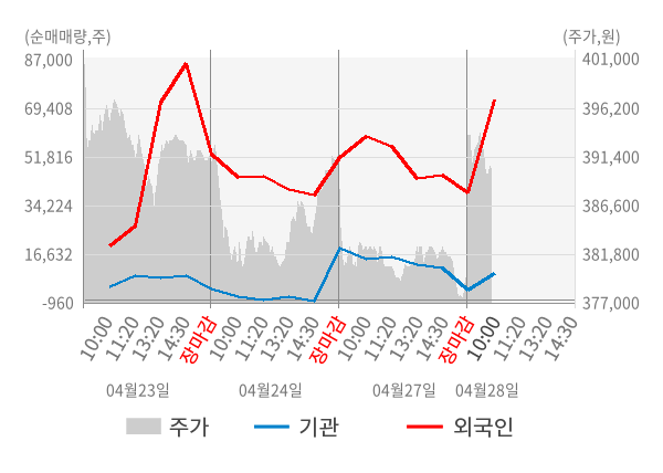 [서울=뉴스핌] 로보뉴스 = 28일 10시 15분 현재 LG화학(051910)은 외국인과 기관이 각각 3.33 만 주, 0.60 만 주 순매수(잠정) 하면서 전일 대비 2.64% (현재가 389,500원) 상승하고 있다.