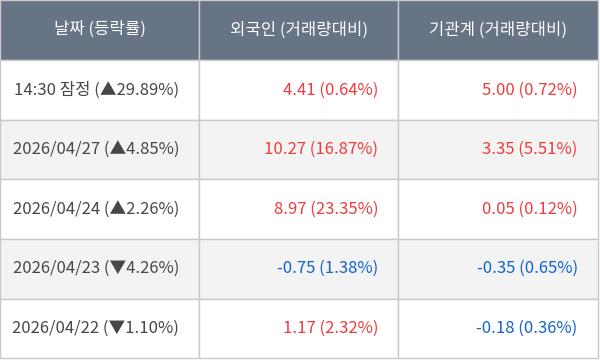 [서울=뉴스핌] 로보뉴스 = 28일 14시 35분 현재 넥스틸(092790)은 외국인과 기관이 각각 4.41 만 주, 5.00 만 주 순매수(잠정) 하면서 전일 대비 29.89% (현재가 21,600원) 상승하고 있다.