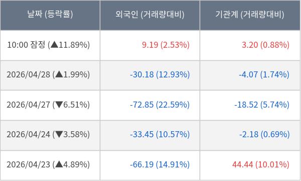 [서울=뉴스핌] 로보뉴스 = 29일 10시 15분 현재 서진시스템(178320)은 외국인과 기관이 각각 9.19 만 주, 3.20 만 주 순매수(잠정) 하면서 전일 대비 11.89% (현재가 57,400원) 상승하고 있다.