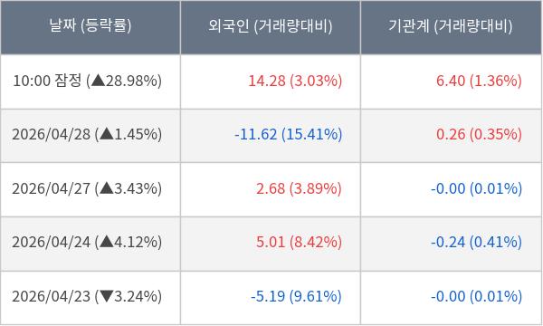 [서울=뉴스핌] 로보뉴스 = 29일 10시 15분 현재 이수화학(005950)은 외국인과 기관이 각각 14.28 만 주, 6.40 만 주 순매수(잠정) 하면서 전일 대비 28.98% (현재가 12,640원) 상승하고 있다.