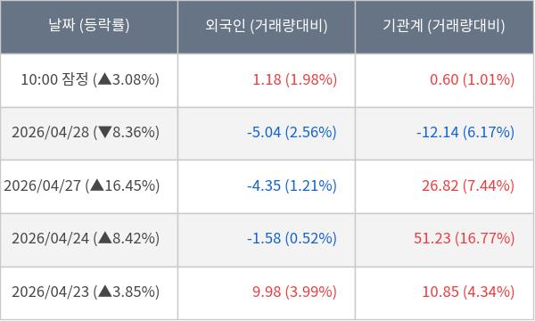 [서울=뉴스핌] 로보뉴스 = 29일 10시 15분 현재 한화엔진(082740)은 외국인과 기관이 각각 1.18 만 주, 0.60 만 주 순매수(잠정) 하면서 전일 대비 3.08% (현재가 83,600원) 상승하고 있다.