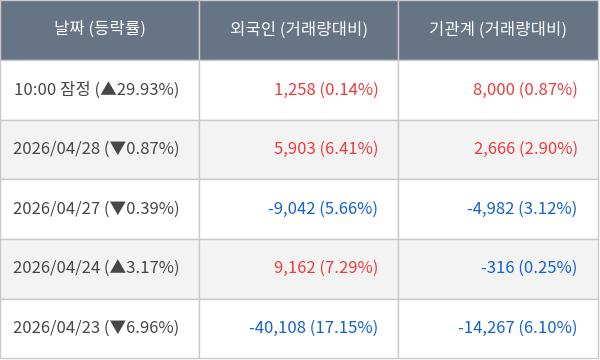 [서울=뉴스핌] 로보뉴스 = 29일 10시 15분 현재 오로라(039830)는 외국인과 기관이 각각 0.13 만 주, 0.80 만 주 순매수(잠정) 하면서 전일 대비 29.93% (현재가 16,280원) 상승하고 있다.