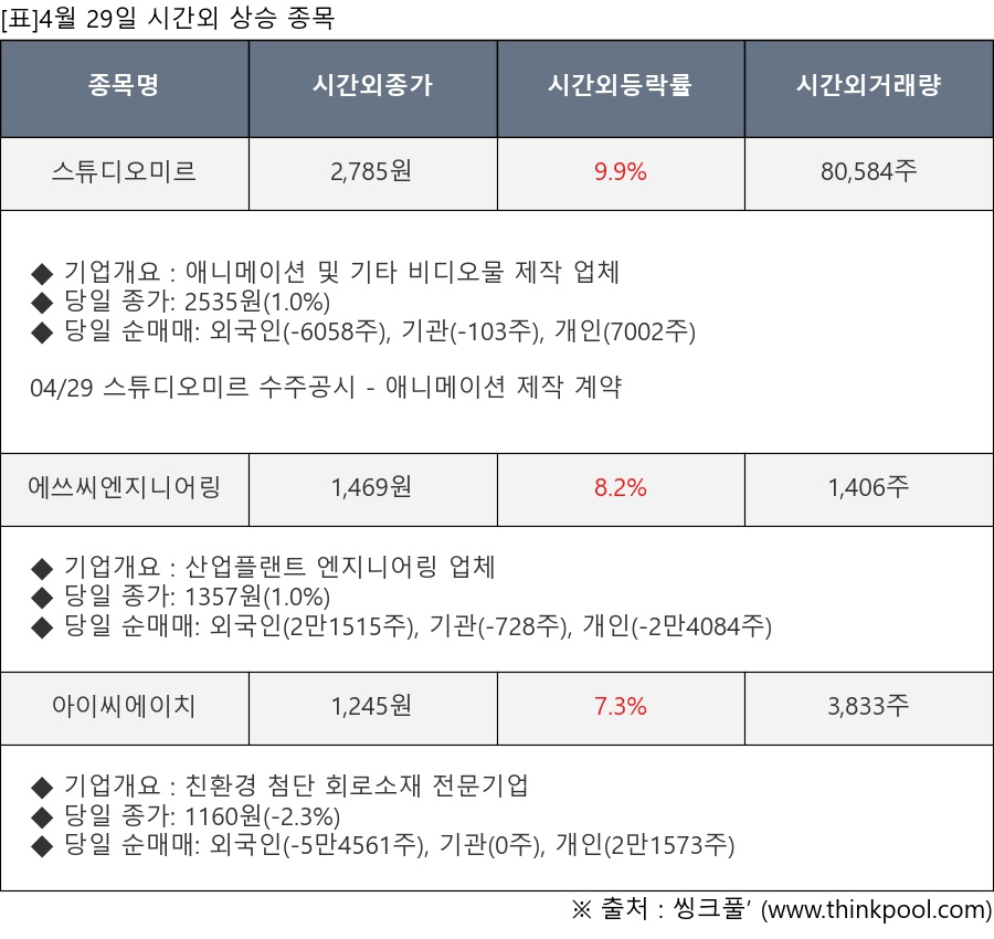 [서울=뉴스핌] 로보뉴스 = 4월 29일, 인공지능 투자비서 ‘AI라씨로’가 스튜디오미르(408900), 에쓰씨엔지니어링(023960) 등 시간외 단일가 매매 상승률 상위 종목들에 대한 최근 동향을 분석했다.
