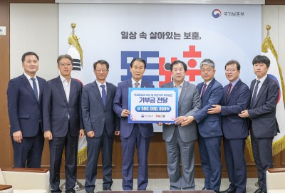 보훈기부금 전달하는 권오을 장관 - 우오현 SM그룹 회장