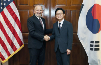 악수하는 김정관 산업통상자원부 장관 - 하워드 러트닉 미국 상무부 장관