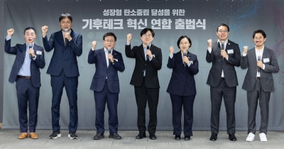 기후테크 혁신 연합 참여기업 대표들과 기념촬영하는 김성환- 한성숙 장관